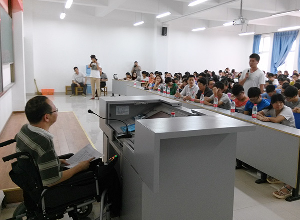 王绍军校友坚强的意志、宽广的胸怀、无私奉献的爱心与化解苦难的智慧,深深打动了在场的每一位师生,不时赢得现场观众的阵阵掌声。在提问阶段,同学们就创业、就业等普遍关注的社会热点问题踊跃发言。他都结合自身经历和创业经验,用幽默风趣的语言给予了一一回答,并提出许多好的建议和意见。