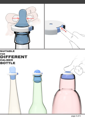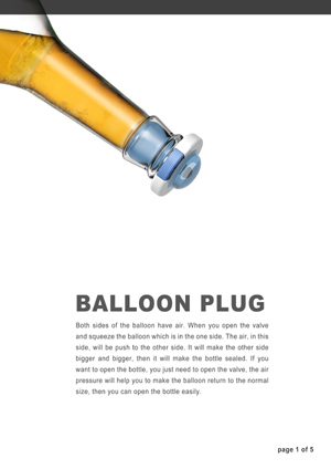 获奖作品《Balloon Plug(气囊瓶塞)》创新了人们对于瓶盖、瓶塞的使用体验和趣味性,通过一键开关的阀门使得气囊塞一侧的空气能够被挤压至另一侧形成膨胀空间,从而对瓶子进行密闭,在需要打开瓶塞的时候也能通过简单操作完成。