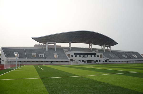 体育场体育建筑等级为丙级,总建筑面积4496平方米,总座位数4314座,体育场全天候型材塑胶地面9043平方米,场地选用国际标准8道跑道,半径36.5米,周长400米。同时设有田赛区域和投掷区域。田径场内设一块标准足球场地,长105米,宽68米,采用人工草坪。看台罩棚采用空间网架结构,造型轻巧美观。看台座席分为八个区域,设有主席台。室外可供体育课教学、课外体育活动、大型集会和综合性田径运动会使用,配套有大型彩色电子显示屏和条幅显示屏、高杆照明灯和高保真音响系统。室内建筑为体育操训用房、体育器械库房、教师办公用房、活动用房和各种功能房等。