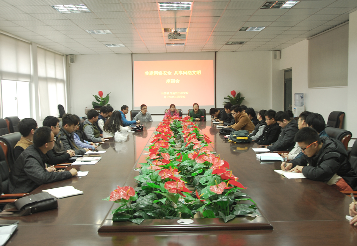 11月27日上午,我校“共建网络安全、共享网络文明”系列活动之网络文明专题座谈会在计算机与通信工程学院会议室召开。教师代表、各学生组织代表近百人参加了座谈会,座谈会由计算机与通信工程学院分团委承办。