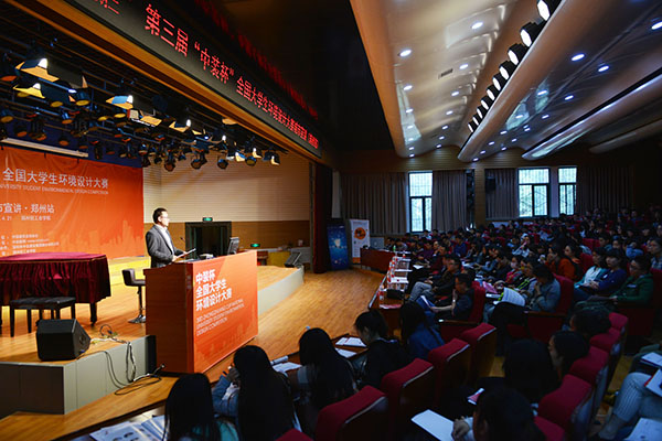 4月21日,第三届“中装杯”全国大学生环境设计大赛城市宣讲活动(郑州站)在我校教一楼演讲厅隆重举行。本次大赛由中国建筑装饰协会主办、中国建筑装饰协会官方网站中装新网承办,深圳市中装建设集团股份有限公司为大赛全程战略合作单位。中国建筑装饰协会副秘书长艾鹤鸣,我校艺术设计学院院长曹阳,中装建设集团股份有限公司副总裁、大赛组委会办公室副主任熊兆宽,中装建设集团股份有限公司武汉设计院院长吴江等嘉宾,以及来自我校环境设计系的师生代表共400余人出席了本次活动。本次宣讲由中国建筑装饰协会涂料与防水材料分会秘书长、中装新网副总编辑罗胜主持。