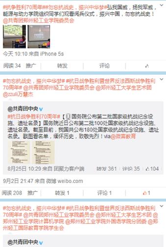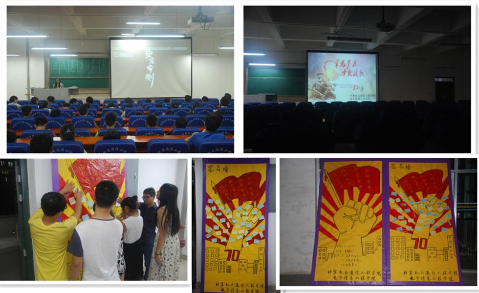 9月1日—3日,能源与动力工程学院深入各班级团支部广泛开展纪念活动,利用展板宣传教育同学们铭记历史,缅怀先烈,并通过学院分团委微博发起话题讨论,在微信公众平台开展网上纪念传递活动。