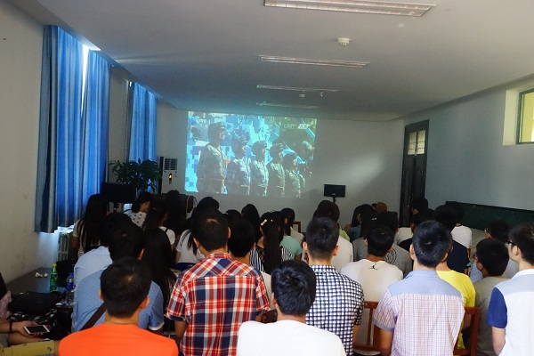 9月3日上午,政法学院在政法楼112室举行观看纪念反法西斯抗战胜利70周年阅兵仪式的活动。政法学院各年级学生代表、学生党员、入党积极分子、全体辅导员准时到场,参加了观看活动。