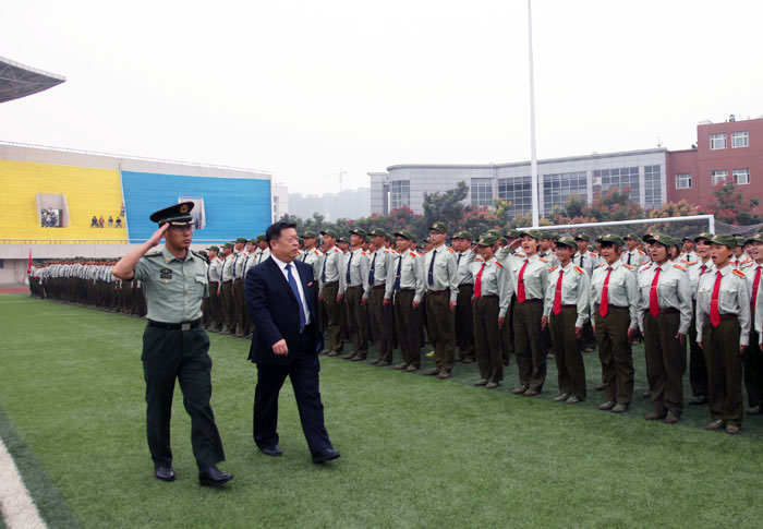 校党委书记石恒真、校长赵卫东分别在两校区出席活动,并在承训部队首长的陪同下检阅了新生军训方队。