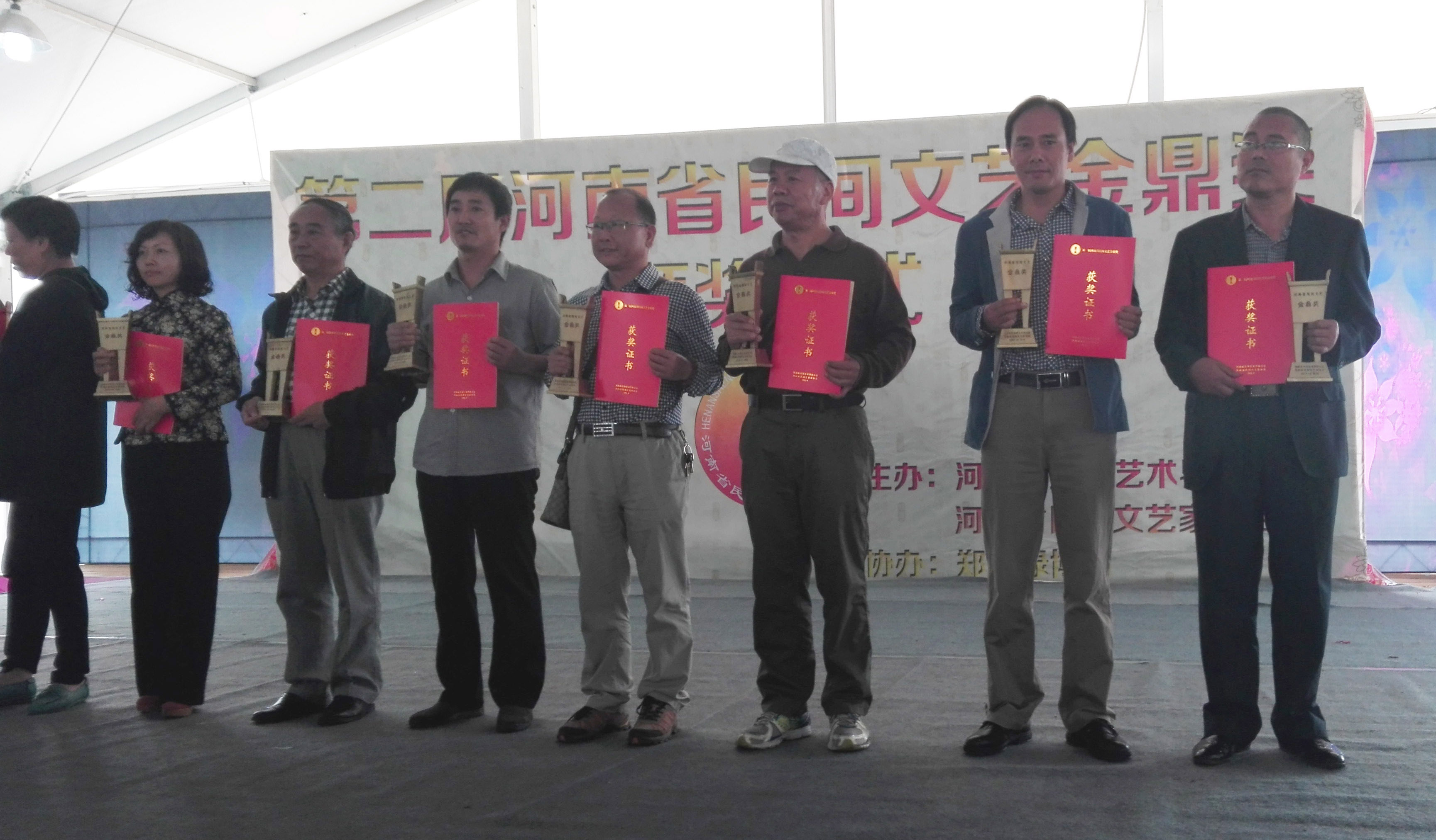 “河南省民间文艺金鼎奖”是经中共河南省委宣传部批准,由河南省文学艺术界联合会和河南省民间文艺家协会联合主办的全省性民间文艺最高奖,每三年评选一次。依照省委宣传部《关于印发〈全省性文艺新闻出版评奖整改总体方案〉的通知》要求和《河南省民间文艺金鼎奖章程》规定,经“河南省民间文艺金鼎奖评奖委员会”认真评审,共评出第二届“河南省民间文艺金鼎奖”69个,其中民间文艺成就奖16个(含个人成就奖和集体奖),民间文艺学术著作奖6个,民间文学作品奖5个,民俗影像作品奖2个,民间工艺美术作品奖19个,民间表演奖21个。