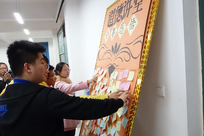 本次活动共分为六个环节。“诵一部经典”环节,为纪念中国人抗日战争胜利70周年,学生代表伴随着一段慷慨激昂的音乐,朗诵了《歌颂祖国》,表达对祖国的深深敬意;“看一段短片”环节,第五届全国道德模范候选人冷木的先进事迹感动了全场,当看到冷木悉心照料流浪老人胜似亲人,无怨无悔、不离不弃的时候,同学们无不为之动容;“讲一个故事”环节,志愿者代表王森同学讲述了暑假在贵州省黔南苗族布依族自治州平塘县大塘镇西关村小学义务支教一个月的心得感悟,为大家分享了爱与奉献的故事,让在场同学感受到当代大学生应有的精神风貌;“唱一首歌曲”环节,同学们全体起立同唱青春励志歌曲《我的未来不是梦》,表达当代大学生对美好未来的执着追求;“开展一次互动”环节,在座同学从自身经历、生活感悟、身边故事等方面分别分享自己对道德、对青春的理解与认识;“分享一份感悟”环节,全体同学在留言板上写下自己的道德感悟,表达了作为一名当代大学生应有的责任与担当。