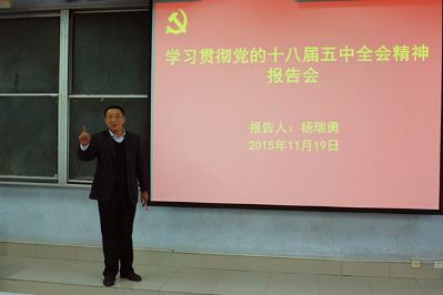 11月19日下午,按照校党委安排部署,学校党的十八届五中全会精神宣讲团成员深入院系,围绕全会审议通过的“十三五”规划建议等会议内容和中央精神,结合学校发展实际为师生进行了第一轮理论宣讲。