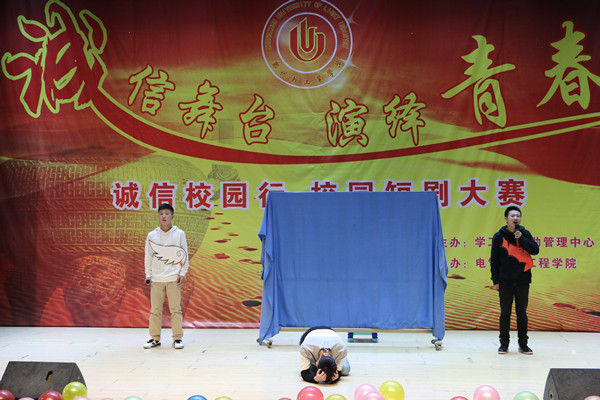 各参赛队以形象的动作、优美的语言、默契的配合引起了台下观众的阵阵掌声。各个节目以不同形式从不同侧面阐述了诚信的重要意义,有的诙谐幽默、令人在捧腹之余回味悠长,有的情节感人、催人泪下,发人深省。经过激烈的角逐,材料与化学工程学院的《路》、电气信息工程学院的《回归》荣获一等奖;大学生艺术团的《五十块钱》、外国语学院的《我们帮你践行承诺》、体育学院的《诚信风波》获得二等奖;计算机与通信工程学院的《用爱浇灌诚信之花》、政法学院的《扶不扶》、建筑环境工程学院的《匆匆那年》、数学与信息科学学院的《诚信让心灵无暇》、外国语学院的《诚信古今》获得三等奖。大赛还评出了最佳男女演员和最佳舞台效果奖。