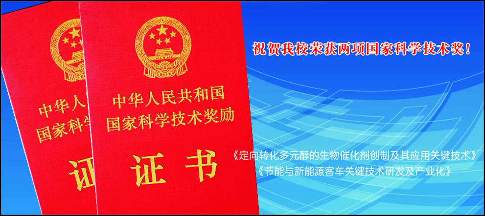 1月8日,2015年度国家科学技术奖励大会在北京人民大会堂隆重举行。党和国家领导人习近平、李克强、刘云山、张高丽出席大会并为获奖代表颁奖。我校与牵头单位共同完成的“定向转化多元醇的生物催化剂创制及其应用关键技术”和“节能与新能源客车关键技术研发及产业化”两项科研成果分别荣获国家技术发明奖二等奖和国家科学技术进步奖二等奖。