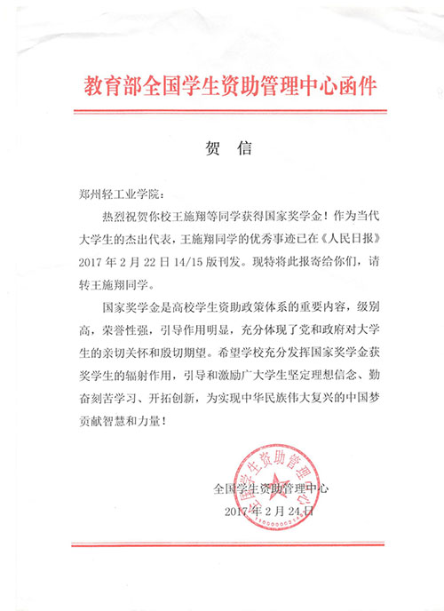 近日,全国学生资助管理中心为我校发来贺信,对我校国家奖学金获得者王施翔同学表示祝贺,对我校学生资助工作给予肯定。希望学校充分发挥国家奖学金获奖学生的辐射作用,引导和激励广大学生坚定理想信念、勤奋刻苦学习、开拓创新,为实现中华民族伟大复兴的中国梦贡献智慧和力量。