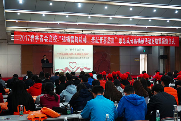3月11日,河南省红十字血液中心2017春季省会高校“弘扬雷锋精神,奉献青春热血”单采成分血捐献活动暨授旗仪式在省红十字血液中心举行,我校政法学院、国际教育学院、青年志愿者协会60余名师生参加了授旗仪式,受邀参加授旗仪式的还有河南牧业经济学院、河南医学高等专科学校和郑州职业铁路技术学院的志愿者师生代表。