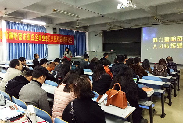 校毕业生就业指导中心、研究生工作部与研究生处按照学校要求,认真准备,积极宣传,精心组织,给新疆来校招聘的领导留下了很好的印象。会上首先播放了哈密市引进高层次人才宣传片。接着,哈密市委组织部人才办蒋鹏程副主任着重介绍了引进人才的有关政策、待遇、条件等情况,并回答了研究生同学关心的问题。积极地引进人才政策和就业岗位及良好待遇等,吸引了很多研究生的注意,现场进行了深入的交流。根据哈方安排,有意到哈密工作的毕业研究生会后可随时与哈方取得联系,面试面签。