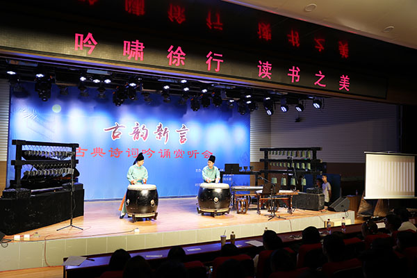 赏听会以二人斗鼓开场,现代技法与古典乐器相配引领听众穿越了一条时空之旅。在吟诵展示中,郑州轻工业学院和河南师范大学新联学院吟诵社的学生以字调吟诵交互呈上《诗经》的《鹿鸣》《关雎》《文王》《清庙》《子衿》,《汉乐府》的《北方有佳人》,李白的《忆秦娥》等作品,精彩纷呈。期间,郑州轻工业学院吟诵社还用华调吟诵了唐代格律诗,范式谨严、音调古朴,把赏听会引向高潮。