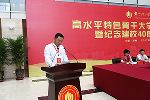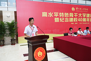 校党委书记石恒真教授讲话。他指出,本次高水平特色骨干大学建设发展论坛暨纪念建校40周年座谈会是一次共同回首郑州轻工业学院薪火相传、弦歌不辍的发展历程,共同分享轻院人拼搏奋斗的自豪与荣光,共同展望学校未来发展的美好愿景的大会。他代表学校全体师生员工,向出席会议的各位嘉宾、各位校友以及长期以来关心支持学校事业发展的社会各界朋友表示衷心的感谢。在与大家一同回顾轻院40年的发展历程之后。他表示,将郑州轻工业学院建成一所以工为主、轻工特色鲜明、学科优势突出、国内有较大影响、多学科协调发展的高水平特色骨干大学,是我们全体轻院人的共同梦想,也是时代赋予我们的光荣使命。近年来,学校党政领导班子科学施策、精准发力,补齐发展短板,厚植发展优势,干成了一批强基础、利长远的大事要事,办成了一批多年想办而未办成的实事难事,学校综合实力快速提升,呈现出前所未有的良好发展态势:工科办学特色更加凸显;人才培养质量稳步提高;人才强校战略成效突出;学科科研实力显著提升;和谐发展氛围更加浓厚。他强调,今后,我们将紧紧围绕这一发展目标,继续坚定不移的走以提高质量为核心的内涵式发展道路。坚持以德树人,把人才培养作为中心任务,把提高质量作为永恒主题,不断提升内涵发展水平,努力办人民满意的中国特色社会主义大学;坚持特色发展,按照“双一流”建设要求,贯彻有所为有所不为原则,巩固学科优势,强化办学特色,提升核心竞争力;坚持创新驱动,继续深化综合改革,以改革推动创新,以创新引领发展;坚持人才强校,继续把人才作为办学兴校的第一资源,持之以恒推进人才强校战略,打造名师荟萃、大师云集的人才高地,为学校可持续发展提供战略支撑;坚持开放办学,开阔国际视野,引进优质资源,拓展合作领域,提升合作层次,深化学术交流,扩大国际影响,提高国际化水平。他坚信,在省委省政府的正确领导下,在社会各界的大力支持下,在全校师生员工和广大校友的共同努力下,我们的目标一定能够实现。