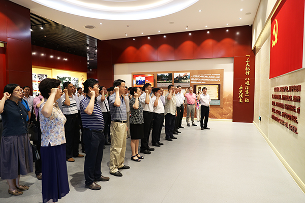 在中国共产党入党誓词展示墙前,全体人员庄严肃立,重温入党誓词,决心铭记誓言,不忘初心,继续前行。