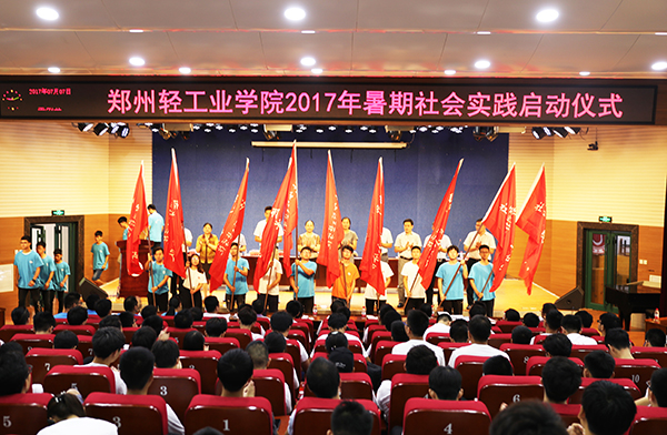 校团委书记葛勋宣读了我校《关于组织开展2017年郑州轻工业学院大学生暑期社会实践活动的通知》。马克思主义学院聂海杰老师作为指导教师代表发言,材料与化学工程学院周云峰、数学与信息科学学院王长山作为学生代表发言。之后,马英和与会职能部门负责人一起为我校2017年大学生暑期社会实践重点团队授旗。