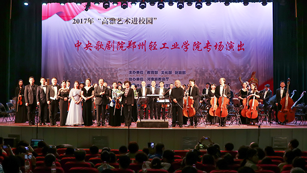 10月26日晚,我校东风校区大礼堂,来自中央歌剧院及河南交响乐团的艺术家们为我校一千多名师生奉献了一场精彩绝伦、激情四溢的音乐盛宴,学校大礼堂成了一片欢乐的海洋。演出在经典歌剧《卡门》序曲中拉开序幕,艺术家们热情洋溢的表演很快点燃了现场观众的激情。他们神采飞扬、声情并茂,倾情投入地演绎诠释着一个个生动鲜活的人物和令人难忘的故事,《霍夫曼的故事》、《采珠人》、《风流寡妇》、《塞维利亚的理发师》、《卡门》、《图兰朵》等经典歌剧的精彩片段把大家带入了美妙的歌剧世界。其间,我校学生还受邀上台与艺术家们同台演出,场面热烈温暖。最后,演出在艺术家们热情洋溢的《饮酒歌》中落下帷幕。观众全体起立,以热情的掌声与喝彩向艺术家们表达由衷的敬意。