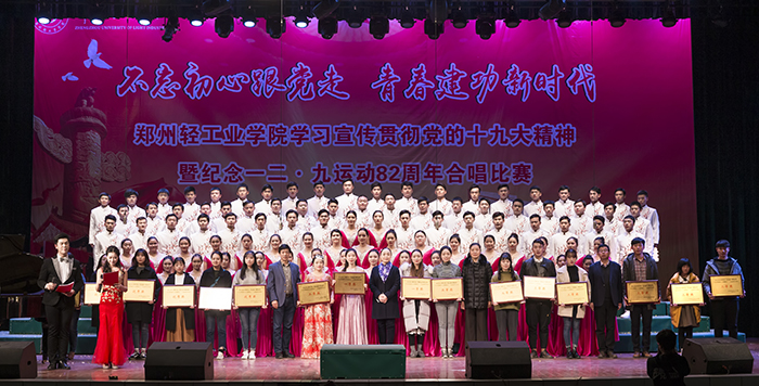 127日,我校“不忘初心跟党走,青春建功新时代”学习宣传贯彻党的十九大精神暨纪念一二•九运动82周年合唱比赛在东风校区大礼堂隆重举行,校党委副书记马英出席并为获奖单位颁奖。