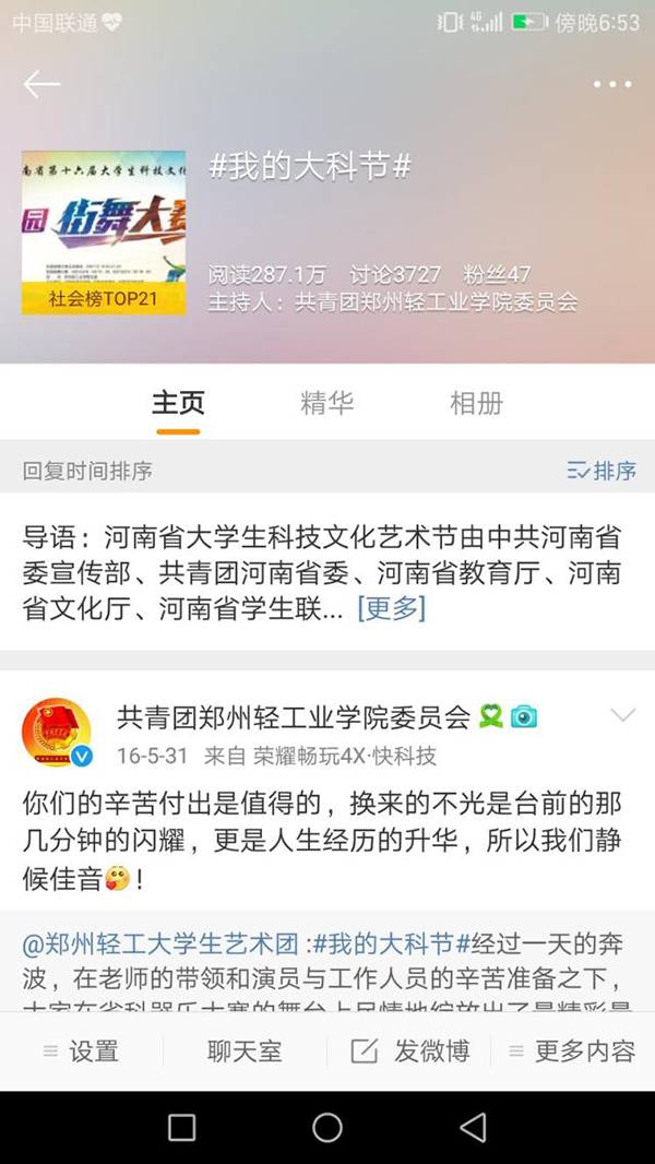 比赛开展期间,我校团委在官方微博发起#我的大科节#微博话题,并在比赛现场设置微博大屏幕,参赛选手和观看大学生积极参与话题互动,话题在微博社会榜排名第八,截止到发稿,参与话题人数达287万。