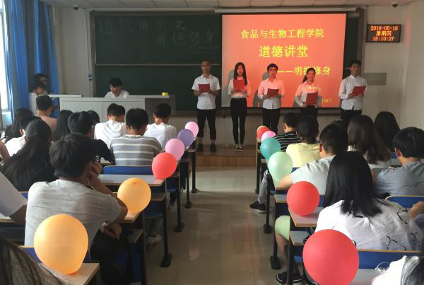 食品与生物工程学院为提升学生的道德水平和人文素养,开展了道德讲堂之“明德修身”主题教育活动。活动通过“诵一段经典”、 “赏一段视频”、 “讲一则故事”、 “品一则寄语”让大家体会到崇德向善、见贤思齐的社会风尚,引导大家反省并修正自身不足,做一个德行兼备之人。