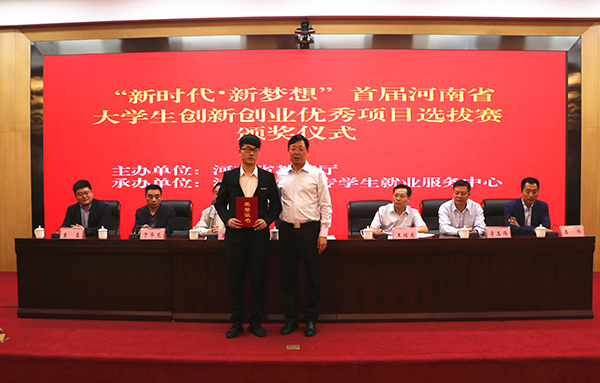 近日,“新时代·新梦想”首届大学生创新创业优秀项目选拔赛在河南省大学生就业创业综合服务基地举行,省教育厅副巡视员李金川等领导出席活动并为获奖团队颁奖。我校学生在此次比赛中表现突出,取得了优异成绩。