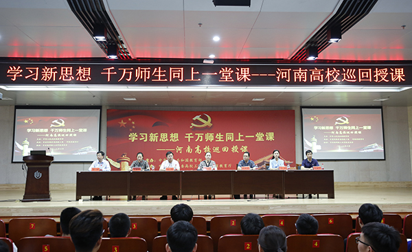 6月14日下午,“学习新思想 千万师生同上一堂课”活动在我校科学校区学术报告厅举行。河南省高校巡回授课宣讲团成员郑州航空工业管理学院思想政治理论教学部主任甄尽忠、河南师范大学辅导员高彬、郑州幼儿师范高等专科学校辅导员高翔为我校师生作专题宣讲。校党委副书记马英出席宣讲会并致辞。党委宣传部、党委学工部、校团委等部门负责人,科学校区辅导员、学生代表共500余人聆听了报告。