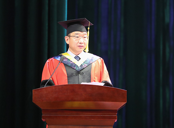 致辞中,他带领大家深情回望了同学们在轻院弥足珍贵的大学时光。并代表所有的师长送给全体毕业生四句话,作为离别赠言,也作为他们在大学的最后一课。一是要仰望星空、坚守梦想。要将理想、价值和才学与国家命运联系起来,矢志不渝、砥砺奋进,在实现中华民族伟大复兴中国梦的征途中成就一番事业;要始终保持理想主义、浪漫主义和英雄主义,始终保持知识分子的傲骨;要珍惜时光,留住岁月,努力成为更好的自己。二是要脚踏实地、不断进取。要在今后的日子里,继续弘扬“为之则易,不为则难”的校训精神,踏实做事,诚实为人,立足本职,追求卓越;要永远保持学习和思考的热情,求知若渴,虚心若愚,长存敢为人先的勇气、永不言退的锐气和积极进取的朝气,不断探求新知、追求真理,永葆思想的活力;要找准定位,增长见识,从自己的兴趣出发,以国家的需要为坐标,找到适合自己的路,在顽强拼搏、努力求索中实现自己的人生目标。三是要乐观豁达、大气宽容。要保持积极健康的心态,做到乐观自信,荣辱不惊;胸襟坦荡、大度包容、达观洒脱;要趁着年轻,大胆地走出去,去迎接风霜雨雪的洗礼;要以豁达的心态直面人生的高潮与低谷,以宽容的性情对待人生的失落与坎坷,积极自信地去成就有意义、有价值、有创造的未来。四是要饮水思源、常怀感恩。在今后的工作和生活中,要对培养我们成长成才的国家、社会、学校以及家庭亲友常怀感恩之心,并用实际行动来回馈国家、社会、老师以及父母亲友对我们的培养、支持和帮助,努力成为一个人格健全的人、一个服务社会的人、一个道德高尚的人。