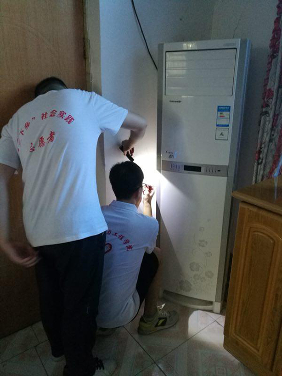 能源与动力工程学院的节能减排推广小分队在李俊丰老师的带领下,来到清东村,运用所学专业知识,为当地居民清洁空调滤网和维修冰箱、空调等家用电器,两天时间内为清东乡乡政府及清东村12户人家共清洗空调16台、冰箱2台。同时,小分队队员还给村民们宣传了家用电器使用常识,发放宣传页百余份,推广了节能减排理念;志愿者们还访谈了4户当地居民,深入了解了当地用水用电节能环保情况。