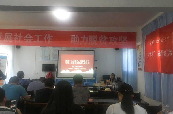 马克思主义学院的党的创新理论宣讲小分队在谢月华老师的带领下,来到清东村,为村民们宣讲普及习近平新时代中国特色社会主义思想和党的十九大精神。7月16日下午,谢月华博士在清东村村进行了一场精彩题为《解读十九大报告:打赢脱贫攻坚战,决胜全面建成小康社会》的宣讲。这场宣讲既有理论高度,又有现实意义。这是一场富有激情和感染力的讲座,给现场听众带来了极大的精神鼓舞,为村里群众打赢脱贫攻坚战、决胜全面建成小康社会带来了信念和力量。