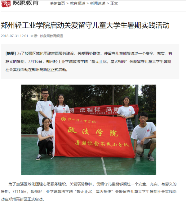 | 18 | 政法学院 | “爱无止尽,星火相传”关爱留守小分队 | 映象网:郑州轻工业学院启动关爱留守儿童大学生暑期实践活动 |