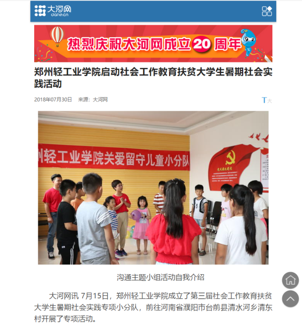 该服务队已被《大河网》所报道:(郑州轻工业学院启动社会工作教育扶贫大学生暑期社会实践活动: