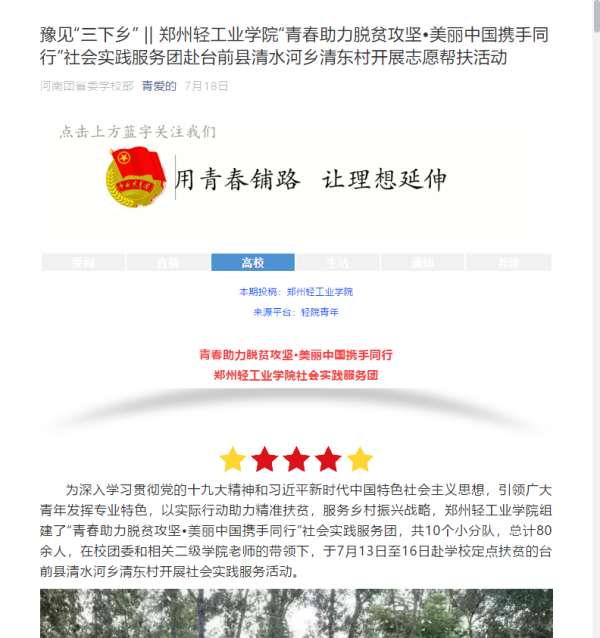 该服务队已被河南团省委学校部微信公众号、微视台前公众号所报道:(豫见“三下乡” || 郑州轻工业学院“青春助力脱贫攻坚•美丽中国携手同行”社会实践服务团赴台前县清水河乡清东村开展志愿帮扶活动:https://mp.weixin.qq.com/s/59z3zoba66bxTcVerrpbJg