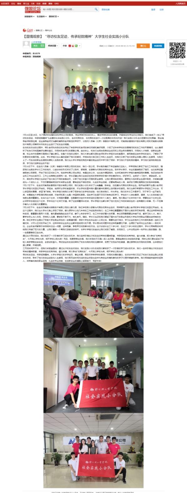 | 6 | “寻访校友足迹,传承轻院精神”走访优秀校友社会实践小分队 | 人民网-强国论坛:【国情观察】“寻访校友足迹,传承轻院精神”大学生社会实践小分队 | |