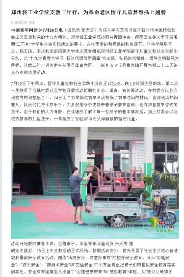 该服务队已被中国青年网所报道:(郑州轻工业学院支教三年行,为革命老区留守儿童梦想插上翅膀: