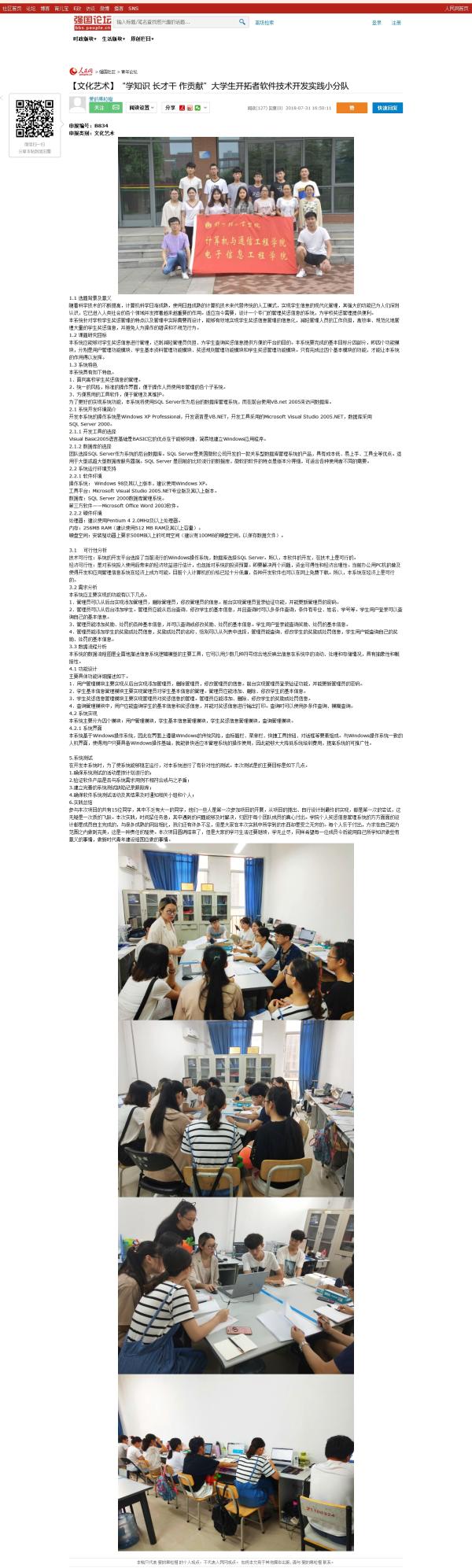 该服务队已被人民网所报道:(【文化艺术】“学知识 长才干 作贡献”大学生开拓者软件技术开发实践小分队: