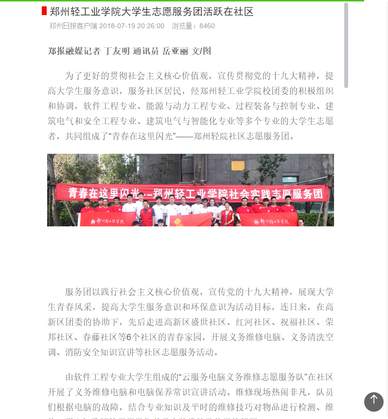 该服务队已被郑州日报报道:(郑州轻工业学院大学生志愿服务团活跃在社区: