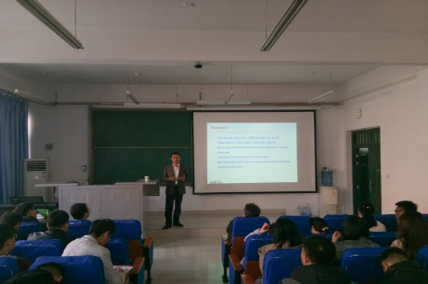 张浩力教授首先介绍了石墨烯、过渡金属硫族化合物、黑磷等多种二维纳米材料的溶液法合成及光电材料应用,对其在固体条件下各种光学性质进行了系统的介绍,并深入浅出的介绍了课题组目前研究的工作内容及取得的一系列成果。互动环节中,张浩力教授与师生提出的问题进行了深入的讨论和交流,使大家丰富了学术知识、扩宽了领域视野,启发了科研思路,为以后的科研发展打下深远而坚实的基础。