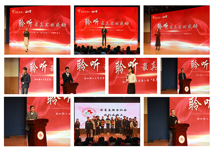 故事会上,计算机与通信工程学院研究生赵永博,计算机与通信工程学院教师司丽娜,图书馆读者服务部教师赵明霞,电气信息工程学院教师张曲遥代表候选人刘智宏,电气信息工程学院研究生李悦功,材料与化学工程学院学生袁子茜代表候选人李飞翰,国际教育学院爱益心(IEC)志愿服务队,广东校友会会长贾国忠代表广东校友会,优秀校友、海信科龙电器股份有限公司冰箱研发中心发泡技术主管胡锋,电气信息工程学院教师曹卫锋依次走上舞台,与大家分享了感人至深、催人奋进的故事,向大家传递了“大爱”的轻院精神和“大美”的轻院力量。
