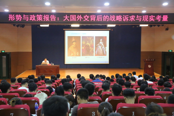 为深入贯彻落实习近平总书记在学校思政课教师座谈会上的讲话精神,提高大学生形势政策教育的针对性、实效性,6月4日上午,校党委书记俞海洛在东风校区演讲厅为师生作题为《大国外交背后的战略诉求与现实考量》的形势与政策报告。相关职能部门同志、马克思主义学院教师、各学院党总支副书记、专兼职辅导员与研究生、本科生代表共三百余人聆听了报告。报告会由马克思主义学院党总支书记朱彧主持。