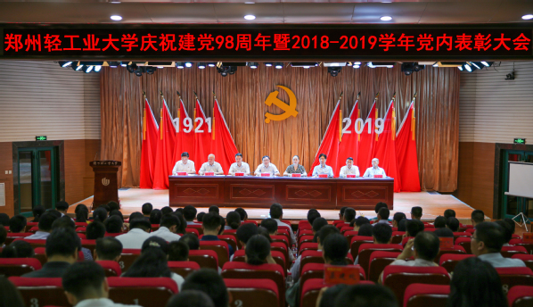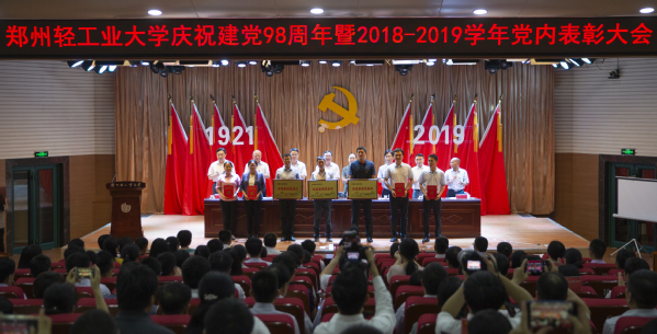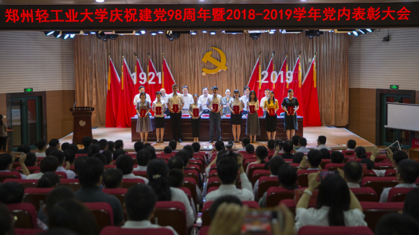 大会在庄严的国歌声中拉开序幕。副校长刘新田宣读了中共河南省委高校工委《关于表彰委管高校优秀共产党员、优秀党务工作者和先进基层党组织的决定》和中共郑州轻工业大学委员会《关于表彰2018-2019学年优秀共产党员、优秀党务工作者和先进基层党组织的决定》。校领导向受表彰的先进集体和优秀个人代表颁发了奖牌和荣誉证书。材料与化学工程学院党总支书记康国磊、食品与生物工程学院学生第一党支部书记李燕、经济与管理学院行政教工党支部书记时军鸽、艺术设计学院党总支委员任红印作为受表彰的先进集体和优秀个人作了交流发言。