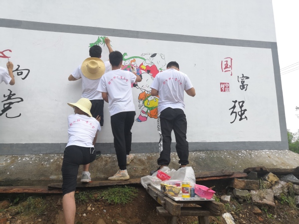 艺术设计学院“艺路有你”墙绘宣传小分队师生一行前往河南省驻马店市泌阳县马谷田镇小韩庄进行了为期4天的美化乡村暑期社会实践活动。队员们到达目的地后,考察测量了村内需要绘制的墙面,并做了初步的墙面规划。活动期间正值酷暑,天气炎热,队员们忍受着高温和蚊虫的叮咬,齐心协力连续作业,共完成13面墙体共计200多平方米的墙绘作品。作品表现手法多样,形式丰富,创作围绕多个弘扬主旋律、传播正能量的主题设计方案。队员们将专业特长、志愿服务和实践精神结合,用手中的画笔为乡村增添更浓的乡味、乡韵和乡情,将艺术融入乡村生活,用实际行动呼吁社会关注新农村环境建设,为环境建设奉献出青年大学生的青春力量。