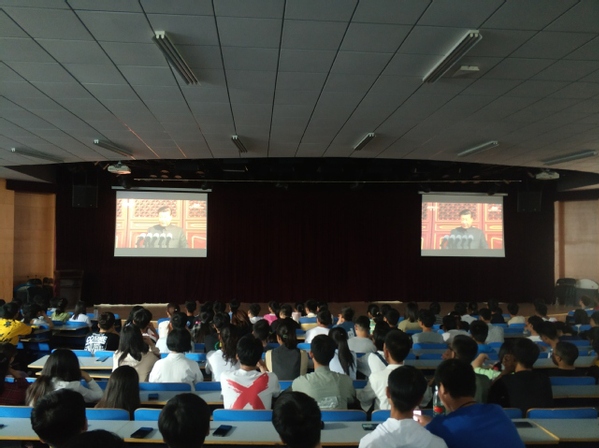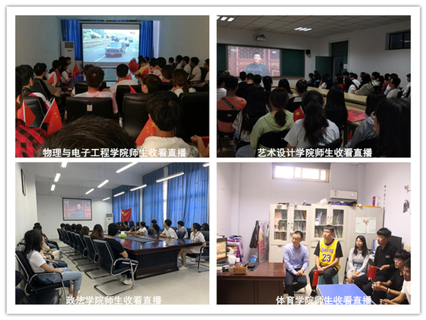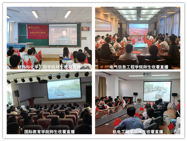 10月1日上午10时,庆祝中华人民共和国成立70周年大会在北京天安门广场隆重举行。中共中央总书记、国家主席、中央军委主席习近平出席大会并发表重要讲话,随后进行了盛大的阅兵式及群众游行。我校在两校区组织师生分别在科学校区活动中心208室、东风校区图书馆学术报告厅、第三会议室集中收看了大会实况,各学院师生通过电视、手机、电脑在会议室、教室、宿舍、校园、实验室等场所收听收看了本次直播盛况。