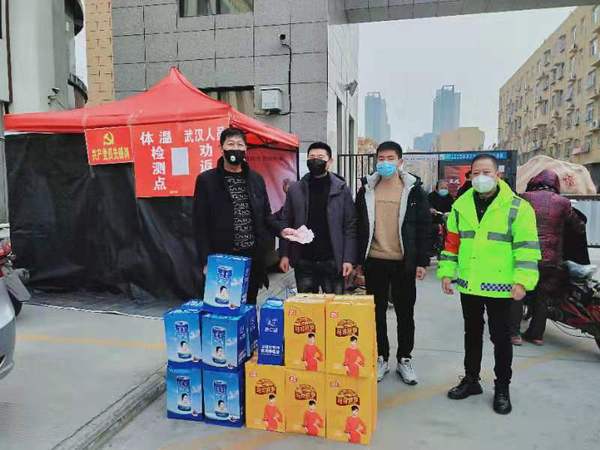刘兆辰(右2)国际教育学院大数据1908班,捐赠食品20箱,现金1000元整,物资由河南省新乡市红旗区留庄营社区防疫站接点。