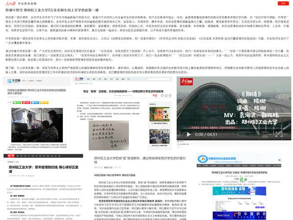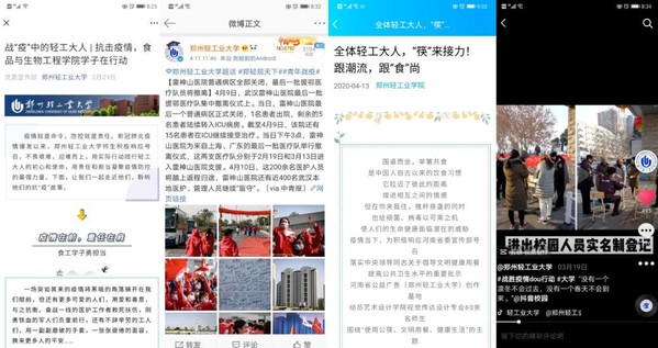设置专题,打造优质作品“生产线”。开设“战‘疫’中的轻工大人”“守护轻工大”等战“疫”专题,搜集整理一线师生的抗“疫”事迹、优秀网络文化作品等,通过图、文、语音、视频等多种形式打造一批提振信心、汇聚人心的网络作品。广泛动员,打造全校平台“联动线”。搭建以学校官方新媒体平台为主导,各二级单位新媒体平台集中互动宣传的联盟传播格局,确保信息的精准送达,提高影响力。积极推送,打造轻大声音“传播线”。疫情期间,学校官方微博、微信、QQ、抖音四个新媒体平台已发布抗“疫”相关文章107篇,微博146条,短视频8个,总阅读量134余万次,在网上有效地传递了轻工大的声音。