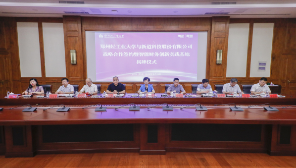 8月31日下午,郑州轻工业大学与新道科技股份有限公司战略合作签约暨智能财务创新实践基地揭牌仪式在郑州轻工业大学科学校区双创中心第一会议室举行。新道科技股份有限公司总裁杨晓柏、郑州轻工业大学副校长王新杰、新道科技大区负责人和课程专家、郑州轻工业大学相关职能部门负责人以及经济与管理学院部分教师代表参加了此次仪式。仪式由经济与管理学院负责同志主持。