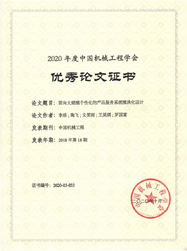 近期,2020年中国机械工程学会年会在杭州举行。在2020年学会年会专题活动——中国机械工程学会期刊研讨会上,颁发了“2020年度中国机械工程学会优秀论文”获奖证书。我校机电工程学院李浩教授、罗国富教授等5人发表的《面向大规模个性化的产品服务系统模块化设计》获2020年度中国机械工程学会优秀论文。该论文此前被评为2018年度领跑者F-5000中国精品科技期刊顶尖学术论文。