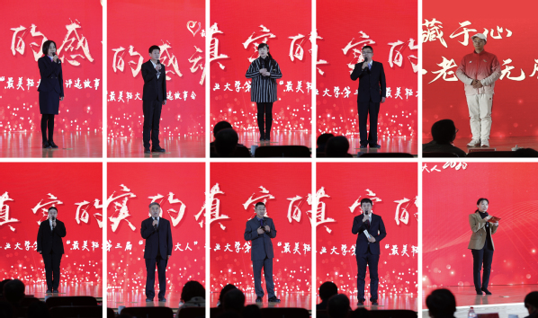 故事会上,轻大档案人代表郭彩峰、建筑环境工程学院学生余双全、马克思主义学院教师毛倩、软件学院教师黄万伟、民运会志愿服务队、国际教育学院学生陶柯辛、材料与化学工程学院教师孙雨安、电气信息工程学院教师王永华、校友总会办公室教师李白毅代表89届校友材料与化学工程学院黄光伟、于书娟女士代表92届校友经济与管理学院王绍军依次走上舞台,与大家分享了感人至深、动人心弦、催人奋进的“最美”故事,向大家传递了“大爱”的轻大精神和“大美”的轻大力量。