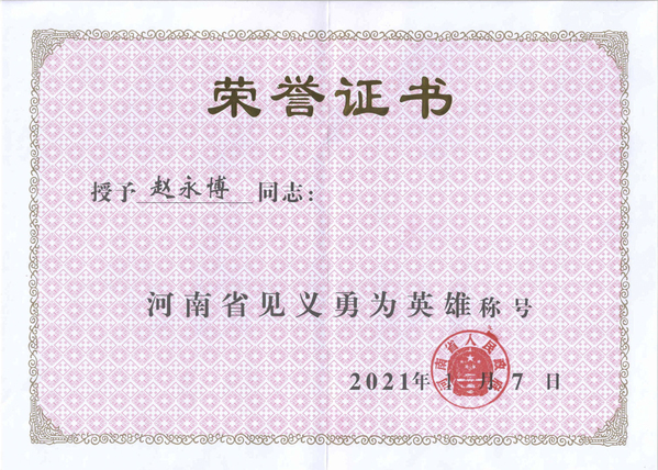 赵永博同学荣获“河南省见义勇为英雄”称号