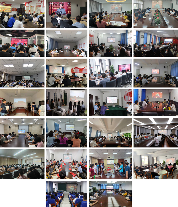 机关党委、电气信息工程学院、机电工程学院、食品与生物工程学院、材料与化学工程学院、艺术设计学院、经济与管理学院、计算机与通信工程学院、软件学院、国际教育学院、政法学院、马克思主义学院、外国语学院、物理与电子工程学院、体育学院、能源与动力工程学院、建筑环境工程学院、工程训练中心、国有资产管理办公室、实验室与设备管理处、保卫处、合作办学管理处、禹州实习实训基地综合服务中心、东风校区综合服务中心、档案馆、附属学校、校医院等单位结合实际,通过电视、网络、手机等渠道,在会议室、办公室等地点收看仪式盛况,学习领会讲话精神。