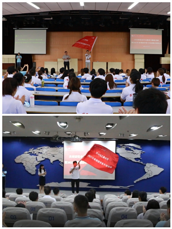7月9日上午,我校共青团党史学习教育专题读书班暨2021年暑期团学骨干培训班开班仪式分别在科学校区学生活动中心楼208室和东风校区图书馆学术报告厅举行。校团委全体工作人员、各学院团委负责人、学校第25期“青马班”学员和2021年暑期团学骨干培训班全体学员共计三百余人参加了本次开班仪式。